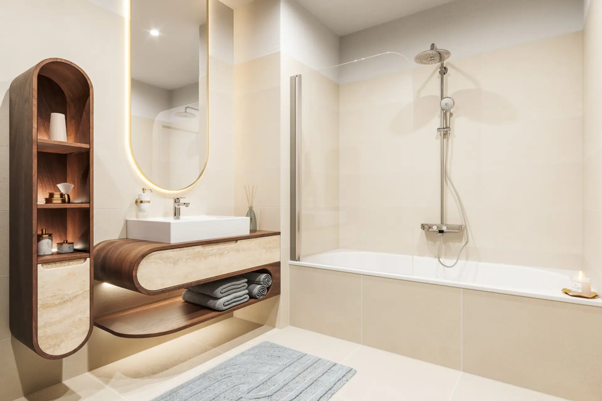 - moderne Badezimmer mit Feinsteinzeug, bodenebener Dusche oder Badewanne
