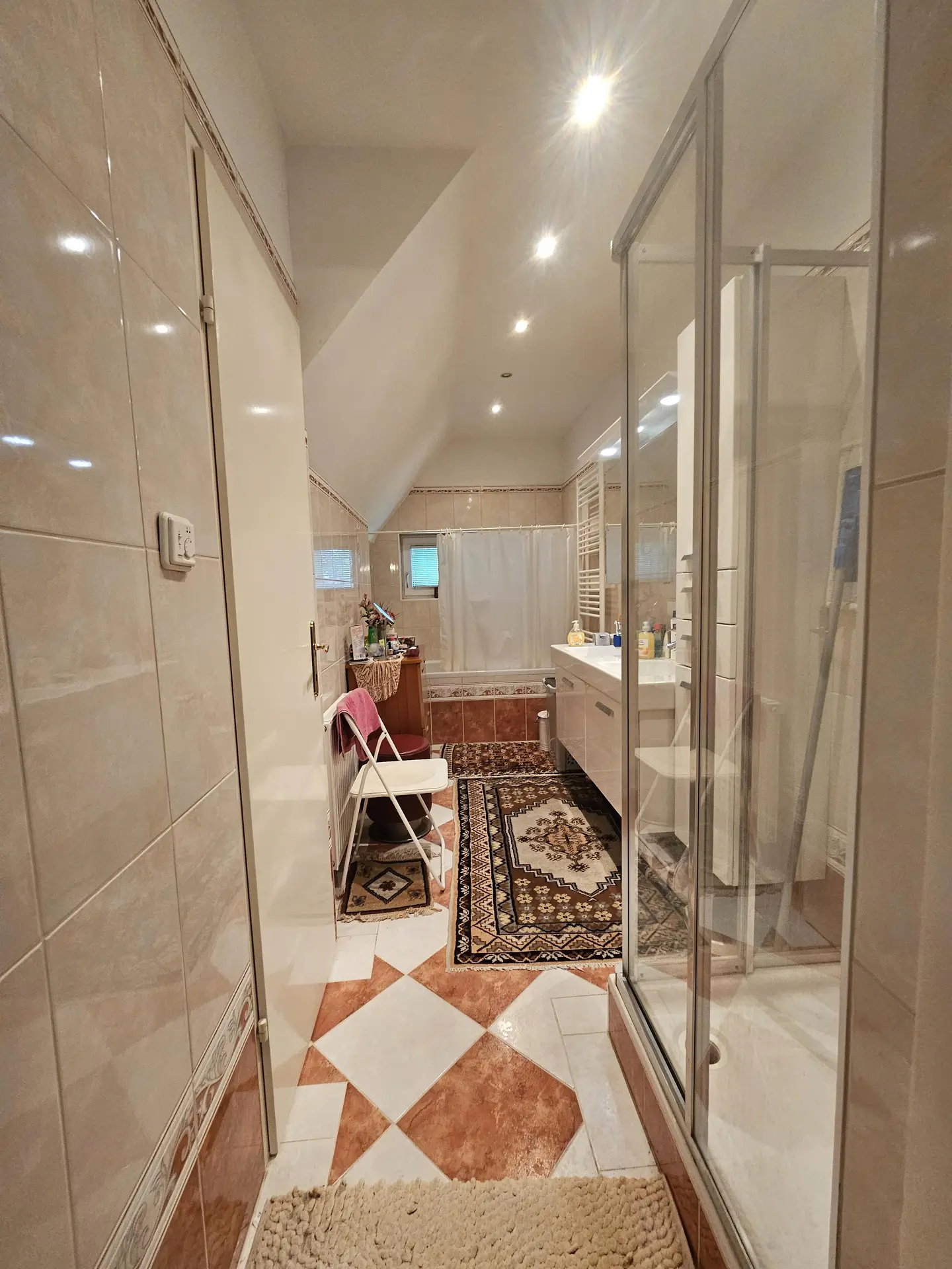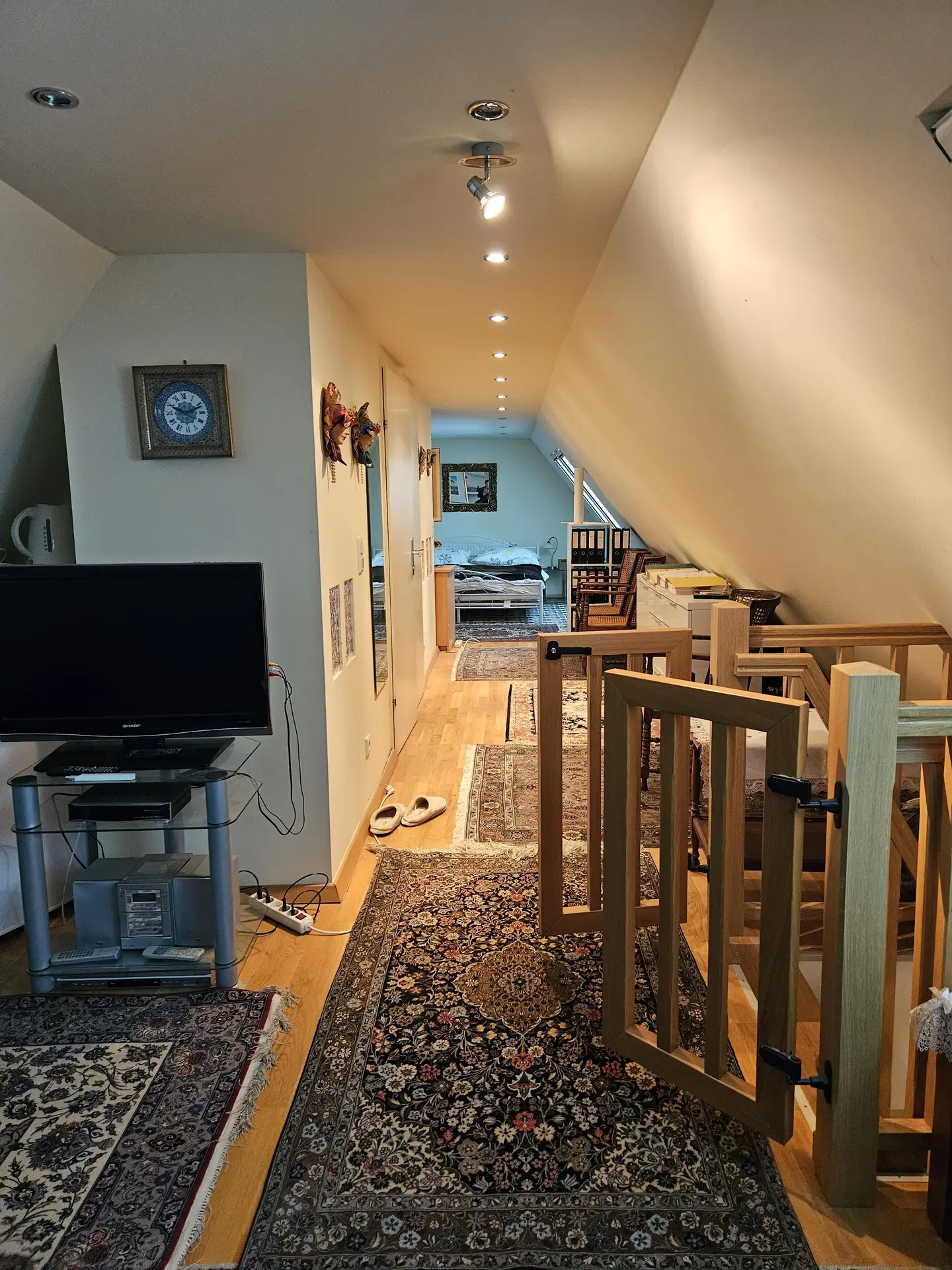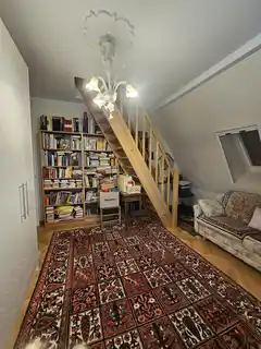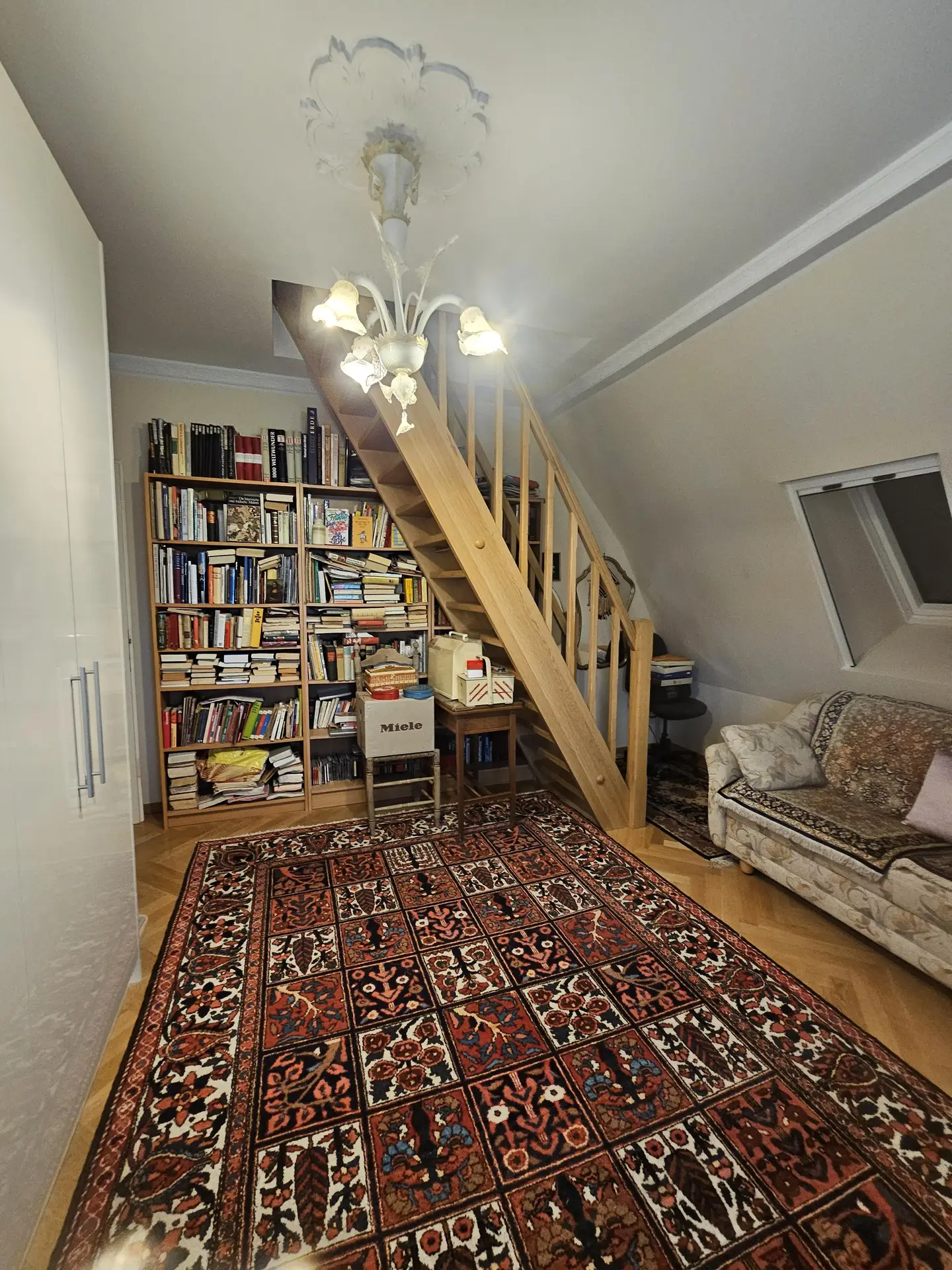 großer offener Vorzimmerbereich mit den Zugängen zu allen Schlafzimmern und Badezimmer sowie noch einen weiteren Abstellraum/Schrankraum. Im rechten Zimmer ist der etwas schwierige steile Stiegenaufgang in das