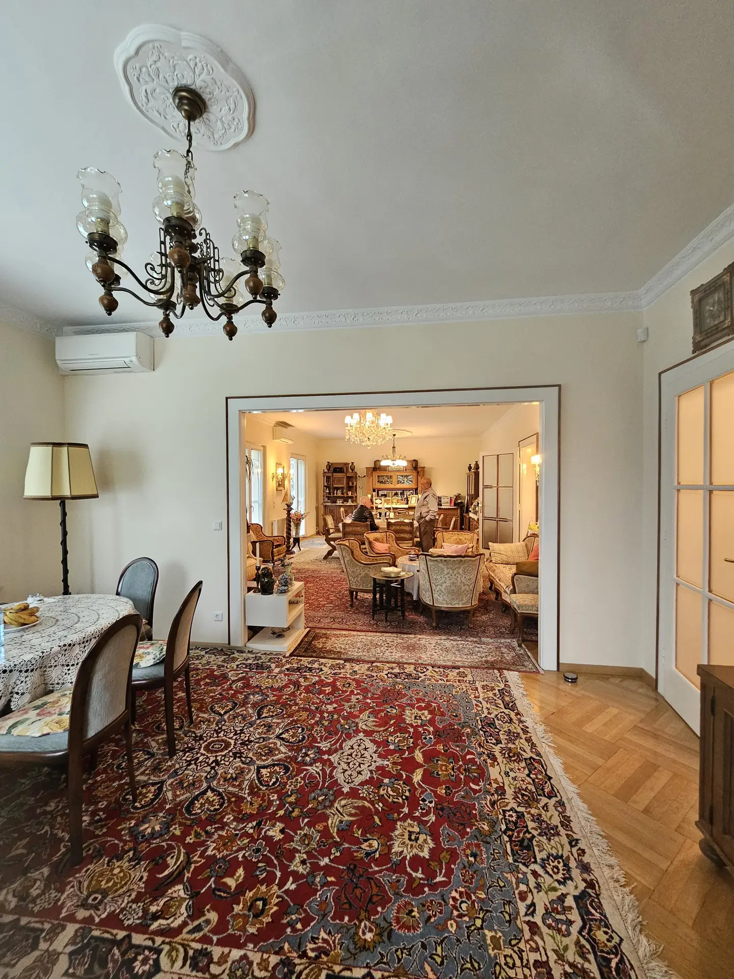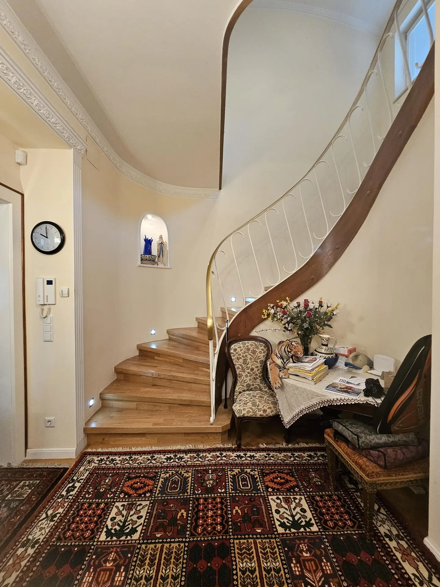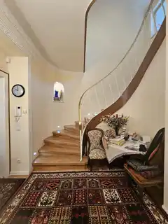Hauseingang, quasi als Windfang eine weitere Tür als Zugang zum großzügigen zentralen Vorzimmer mit dem geschwungenen Stiegenaufgang in die oberen Geschosse. EG gesamt ca. 120 m²