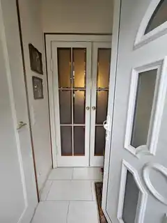 Zwischen Hauseingang und Vorzimmerzugang gibt es Gäste-WC und den Stiegenabgang in den Keller.